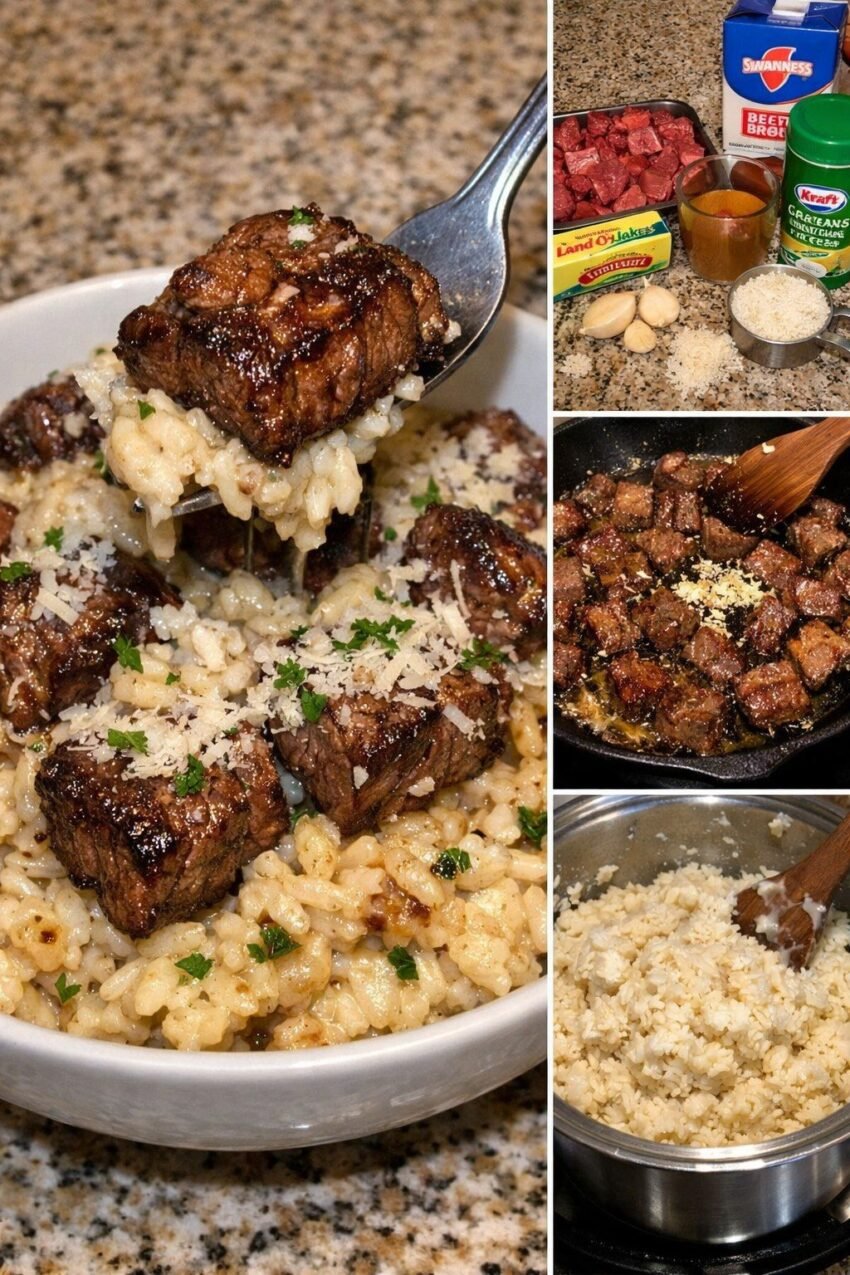 Imagine juicy, golden-seared steak bites coated in rich garlic butter, paired with fluffy rice that’s been stirred with creamy parmesan until it becomes silky and irresistible. Every bite is savory, buttery, and deeply satisfying — the kind of dinner that feels indulgent yet incredibly easy to make.