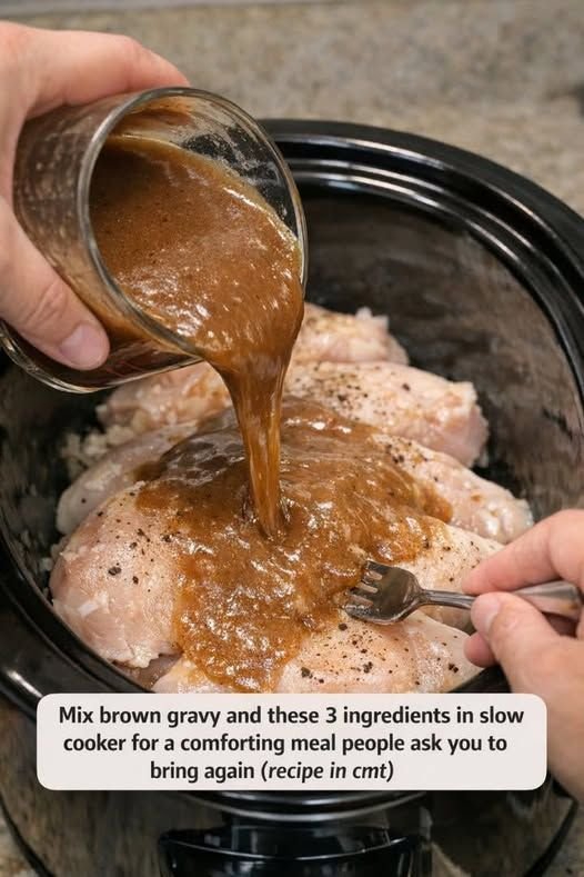 Imagine this: a cold evening, the house smelling like rich, savory brown gravy and tender vegetables. You lift the lid of your slow cooker, and there it is — juicy, melt-in-your-mouth chicken, soft carrots, and fluffy potatoes, all coated in a thick, flavorful gravy that begs to be ladled over everything on the plate.
