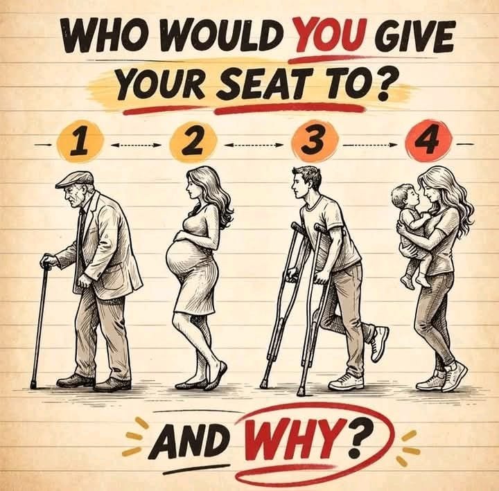 If you had only one seat to give up, who would you choose? An old man, a pregnant woman, a young man, or a mother with a baby. This simple scenario reveals a lot about empathy and priorities.